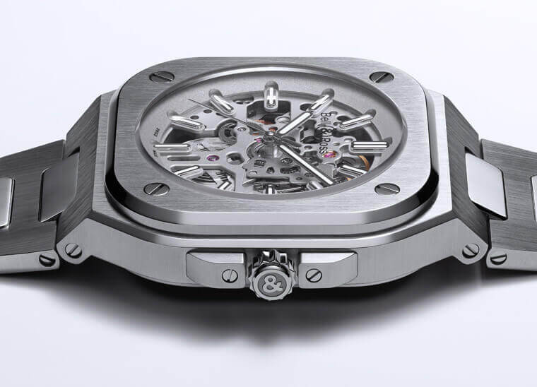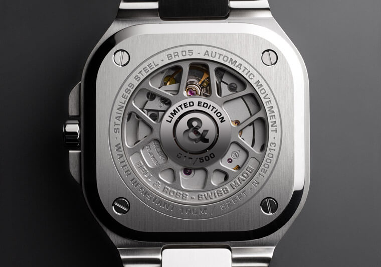 BR05的表径是同系列历来最小的,比BR03的42还小了2mm,只比属于女用款式的BRS(39mm)稍大,像这样的Just-size首先就确立了它足以负担正装用途的泛用性。尺寸之外,新款的造型也反映了这样的属性,原本BR系列的外型是转用自飞行仪表,构造部分是在方形的中壳锁上圆形的表圈——正确来说是在圆形表圈的四角生出了固定螺丝用的底板;BR05修改了这个结构,它的表圈除了开口部是圆形的之外,整体形状基本上是方的,并不像旧款那样明确地区隔出原形的表圈和方形的底版,这点一开始就削弱了它飞行仪表的形象。