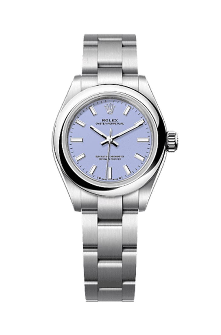 Oyster Perpetual系列的表径共有5种大小,2020年改款后26mm与39mm已经不复存在,目前除了41mm以外,包括28、31、34、36mm等尺寸凭心而论女性佩戴都满适合的,然而如果是针对最容易入手价格这点,目前此系列表径最小的28mm版本是我们想推荐的选择。Oyster Perpetual 28採用不锈钢表壳、拋光表圈加上三板带是中规中矩的设计,其中这款2025年新登场的276200,紫色漆面面盘应该很能获得女性共鸣,而且它的矩形时标简洁俐落,这点会让爱美的女性更有fu。劳力士2020年重新改款Oyster Perpetual系列后,目前系列纷纷换上了3230机芯和2232机芯,其中34mm以下款式搭载的是2232机芯,光就规格而言比起旧机芯有所进化升级,如果还能问到折扣的话,那真的是与劳最近的距离,重点是它的品质也是劳力士等级水准,即使是入门款也还是有一定的高水准。