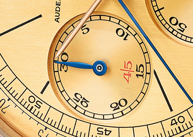▲30分钟积算计的刻度特别在15的上方标出45,显示指针绕到第二圈时的累积分钟;相同的设计常见于古董表款,不过AP这裡另行强调它是因为品牌三代掌门Jacques-Louis Audemars热衷足球才特地加入的。