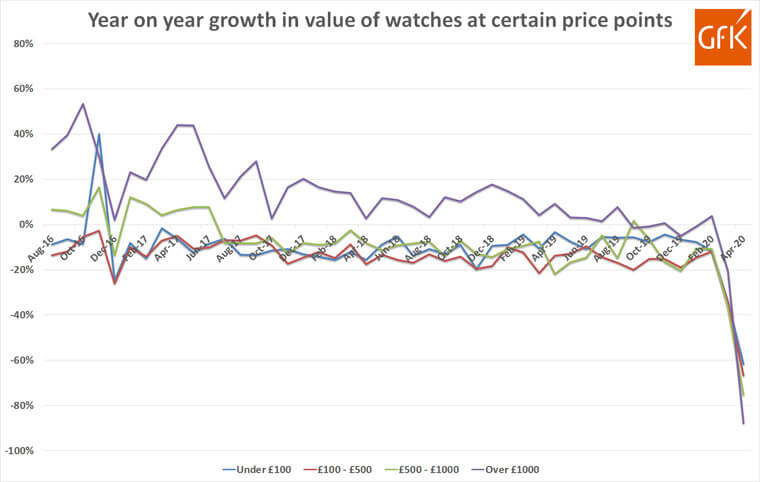 ▲从图表可以看出,英国实体表店不管在哪种价位带的手表在4月份的销售成绩一律往下探底。资料来源:Gfk集团