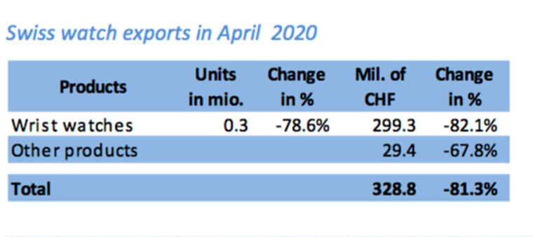 ▲瑞士钟表工业联合会发布的统计资料显示,瑞士钟表产业在2020年4月整体的出口额下降多达81.3%。