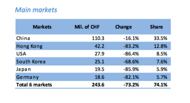 至于单一的市场表现情况也是超级严峻,在4月裡面,所有的瑞士钟表出口市场出口额跌幅都超过两位数,而且大多数还是下滑超过50%以上,在这个月份裡,瑞士的主要出口市场又经过一番大洗牌,首位轮到了中国上位(出口额下降16%),第二名是本身也在水深火热中的香港(出口额跌幅83%),而3月表现令人大吃一惊的美国到了4月退到了第三名,他们在4月的瑞士手表出口额下降达86%,比香港还扯。