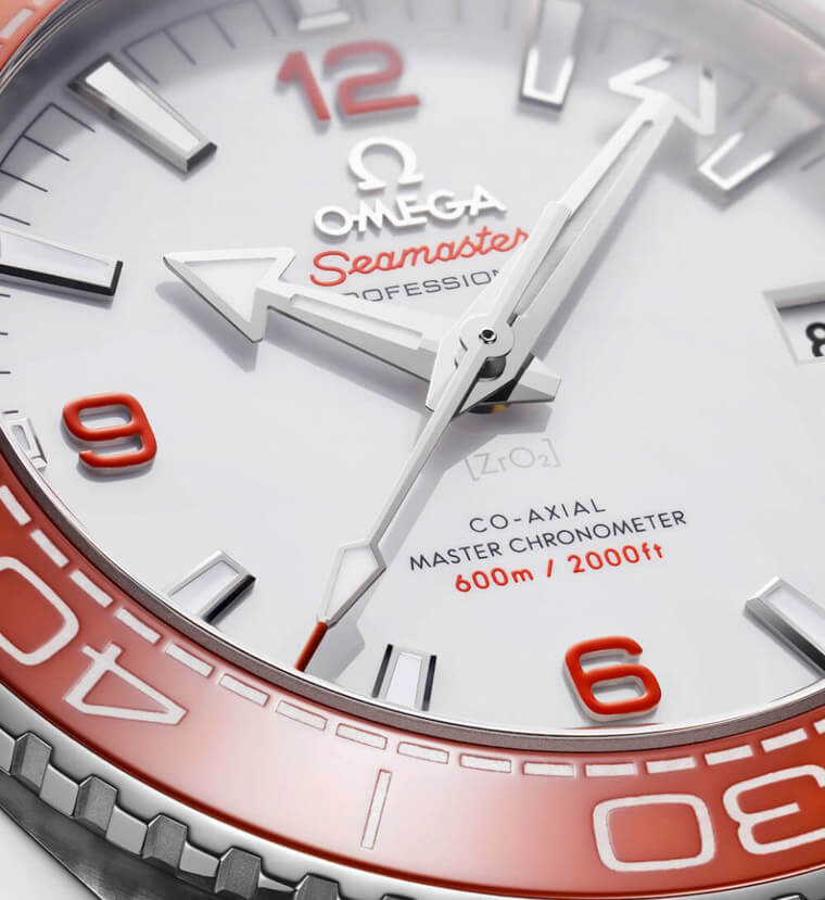 2019年海马Planet Ocean 600米潜水表继2014年的铂金限量款后再度採用橘色陶瓷表圈,这次新款不再限量以满足更多喜爱橘色陶瓷圈的表迷。与过往橘色表圈的海马Planet Ocean 600米潜水表相较,陶瓷材质和铝材质的特性可说是各有千秋,其中陶瓷圈的特点包括橘色偏红、高硬度与高耐磨度等,质感让人一见倾心。新款Planet Ocean 600米潜水表的陶瓷表圈刻度填的是Super-LumiNova夜光涂料,表面较陶瓷圈稍低,触摸时的层次感更强烈。除了陶瓷圈,欧米茄在这两年新款中甚至连面盘都一併採用陶瓷材质,这款也不例外,从它面盘中央下方印上小小的[ZrO2](二氧化鋯)字样可见其材质有别于一般腕表使用的金属。