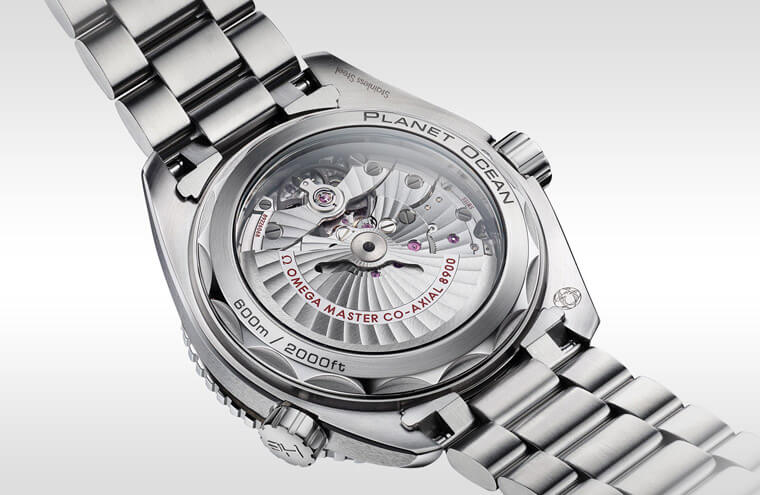 Planet Ocean 600米三针款内载8900大师天文台同轴擒纵机芯,比海马潜水300米搭载的8800机芯更高一级,且8900机芯的直径较大、动力储存也较长。从透明底盖能欣赏机芯之美——机芯自动盘及桥板不只经过镀銠处理显得光彩夺目,且其上皆饰有品牌精心设计与打磨的阿拉伯式日内瓦波纹;补充一提,现行的Planet Ocean 600米底盖外缘造型为波浪形的锯齿状,若没有欧米茄专属的设备,一般的开表工具无法轻易打开,间接巩固原厂机芯的品质。8900机芯同时获得大师天文台(METAS)以及瑞士天文台COSC双认证,通过多项严格标准,确保手表能维持高精准度,更最令人激赏的便是它高达15,000高斯的抗磁性能。此外欧米茄前两年推动将产品保固期延长为5年的政策,虽说手表本身的规格与品质足以令人放心,但能获得更充分的售后保障,对于消费者而言无疑又更加分。