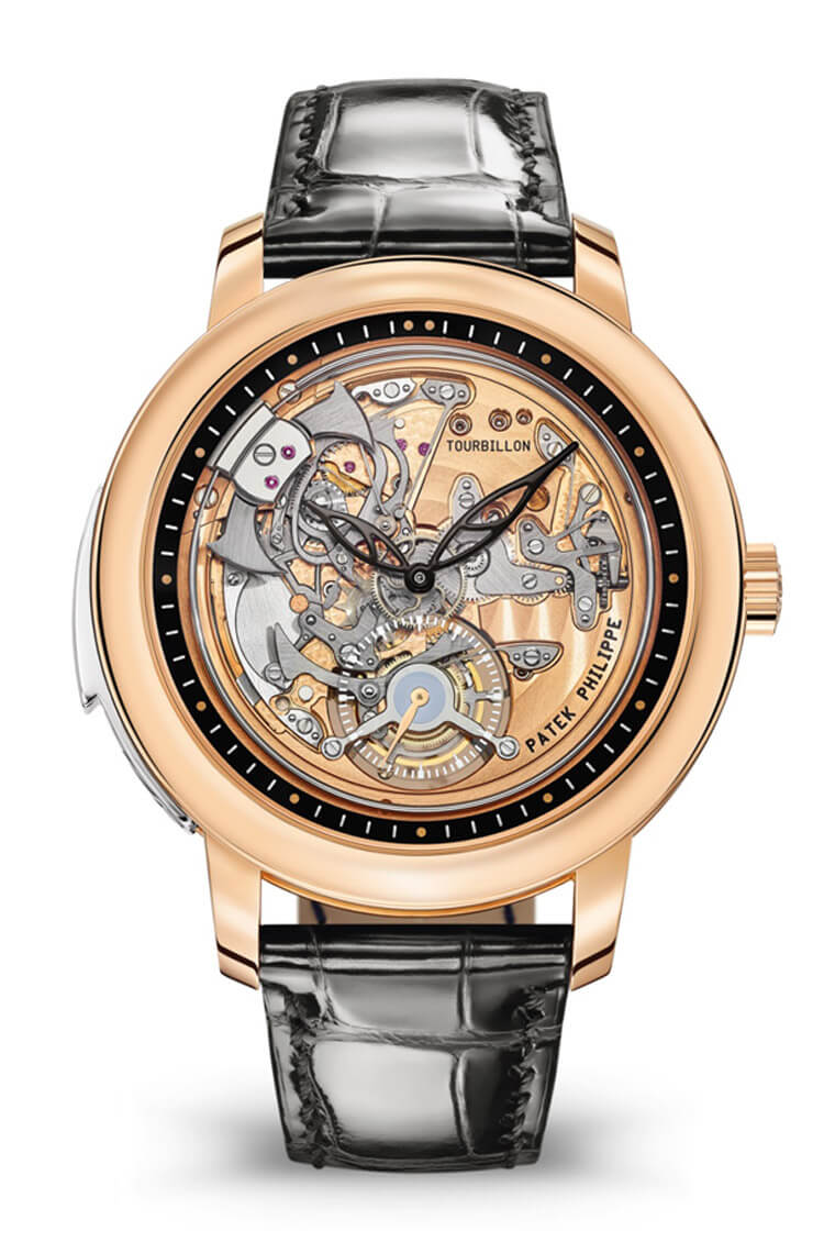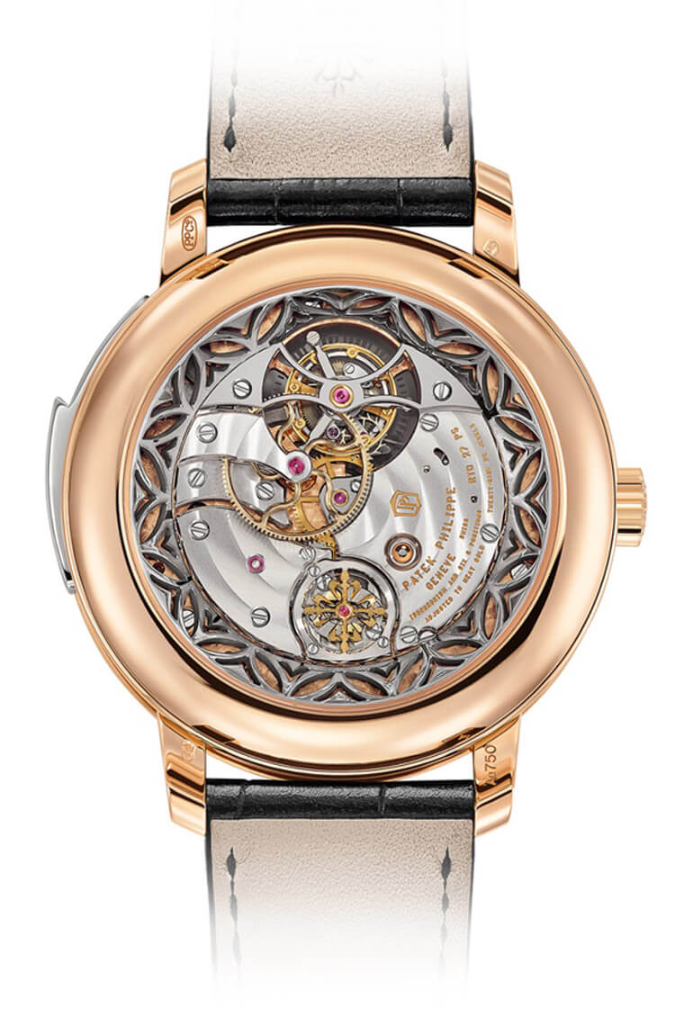 5303R三问陀飞轮早在2019年的百达翡丽新加坡钟表艺术大展已经出现,不过当时PP仅限量发行12只,且仅在新加坡发售,2020年这款表改以新配色正式加入百达翡丽市售系列。5303R-001是百达翡丽首款把三问报时组件设置在面盘侧的超级复杂功能时计,同时品牌也很难得地将陀飞轮也设置在面盘侧,极尽视觉抢眼之能事。2019年的新加坡限定款在面盘外缘的刻度环、小秒针以及皮带缝线上使用红色展现新加坡印象,2020年的市售款则把前述的这些细节改成比较低调的黑色(小秒针则改为与机版相近的玫瑰金色),整体看起来相对内敛,但无论正面背面都还是充满高度赏玩价值。