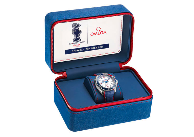 ▲美洲杯联名款特殊表盒包装,上面清楚标示欧米茄将为第36届美洲杯的官方时计。
