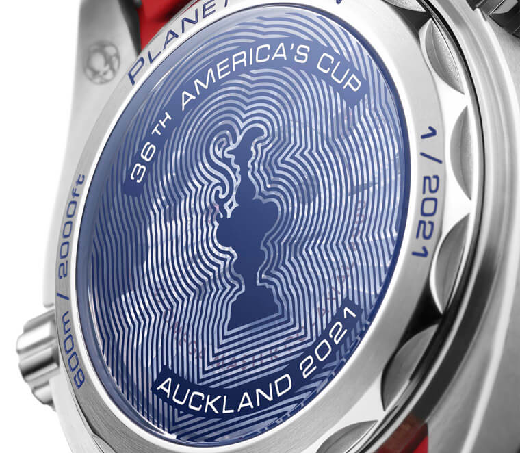 身为联名款,手表肯定会有一些从第36届美洲杯擷取的元素,例如海马Planet Ocean 600米美洲杯限量联名表的整体配色其实就是受到赛事Logo的配色所启发,蓝、白、红三色交替运用在手表的表圈、面盘与表带等细节上。除了表圈和一般的Planet Ocean 600米有别,美洲杯联名款的面盘也有很多专属于这项赛事的特殊设计,包括分针的夜光涂料特别换上红色,另外秒针末端平衡器也改成美洲杯的标志,而表款的白色陶瓷面盘在6点方向更直接了当的印上”36th AMERICA’S CUP”字样,这种联名气氛翻到表背更明显——透明底盖上印有美洲杯字样、2021年开赛年份以及美洲杯和波浪图腾等等,这些有别于一般版的设计让手表看起来更独特,也更突显它限量2021只的身份。
