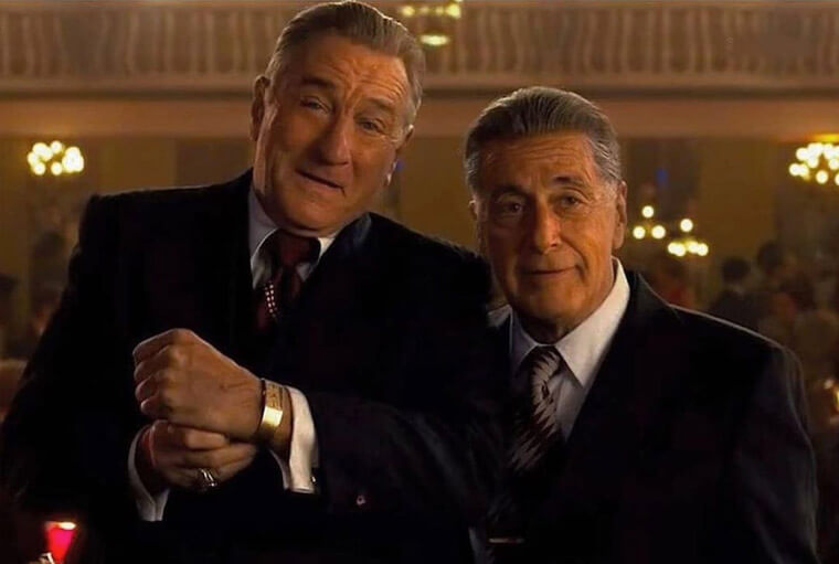 《爱尔兰人》拍得好不好这个小编专业度不足无法评论,至于好不好看则是很个人的体会,问十个人可能就会有十个意见,倒是剧中主角Robert De Niro劳勃狄尼洛在片中手上戴的手表引起了小编的关注,在网路上可以找到一张剧照,照片中可见饰演Frank "The Irishman" Sheeran的劳勃狄尼洛和饰演Jimmy Hoffa的艾尔帕西诺正在合影,而劳勃狄尼洛一边桥自己手上戴的表一边望向相机。