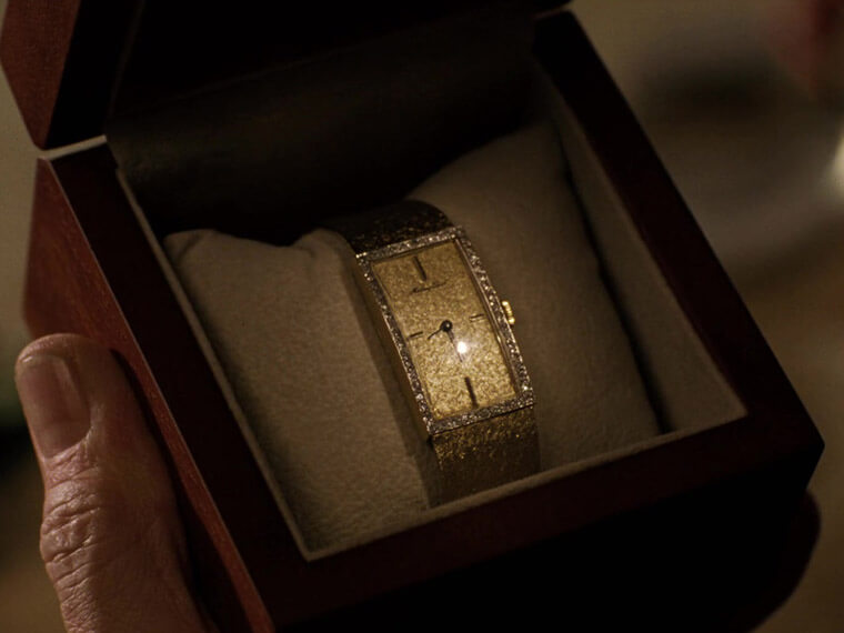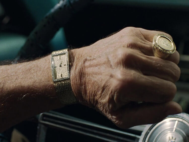 以现代的角度来看,这款MATHEY-TISSOT要说是女表也不为过,因为它的表圈镶满了钻石,然后链带和面盘用上了有点像是伯爵Extremely Lady那种毛皮状手工雕刻技法,看起来颇为精致。不过一来现在人比较没那麼爱方表,二来它金光闪闪的虽然华丽,但不免会让人产生有点老派感的质疑,因此果然就是不同时代对于手表的喜好会有差异,这点看来《爱尔兰人》的剧组在造型设定时也经过一番考察,而不是随便挑了不符时空背景的名表就上镜了,难怪这部电影在专业人士眼中的评价不俗。