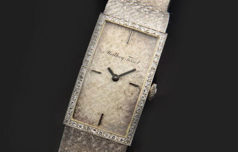 ▲这款MATHEY-TISSOT以贵金属制作,表圈镶满美钻,面盘和链带也经过手工敲击装饰,看起来相当精致。图片:seyboldjewelry.com