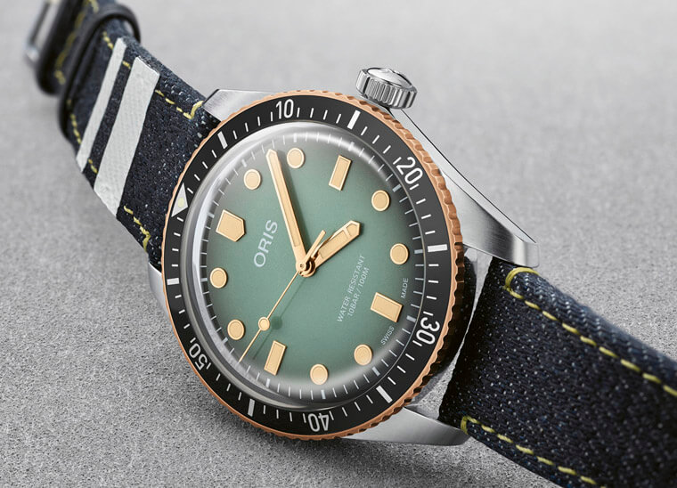 2020年ORIS与日本高级牛仔裤品牌桃太郎Momotaro Jeans合作,发表半铜材质的Divers 65特别版,手表亮点在于借重Momotaro Jeans的牛仔裤Know-how打造手表专属表带。其以靛蓝牛仔布制作手表表带,并坚持採用旧式织布机来编织,从表带上的织纹以及黄色缝线就可看出手工制作的细腻度;另外Momotaro Jeans人气系列——「出阵」招牌的两道白线设计在手表上方表带中也如实再现,让ORIS近年很受欢迎的65潜水表多了一股休閒潮味。