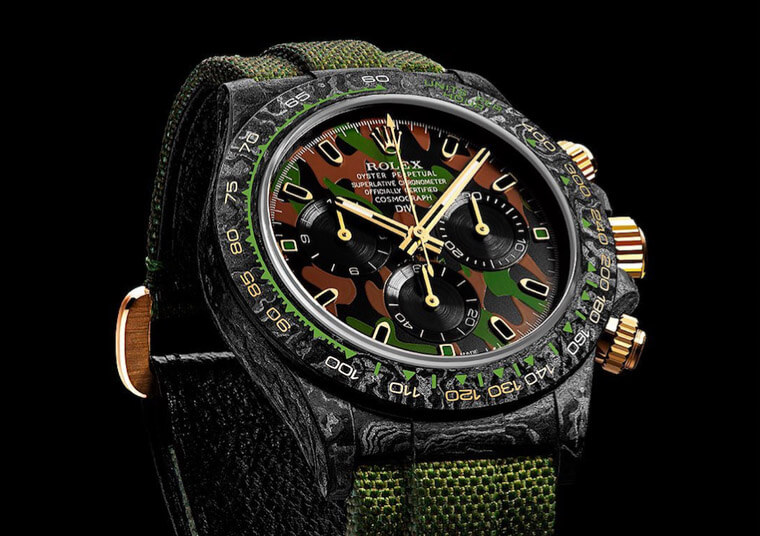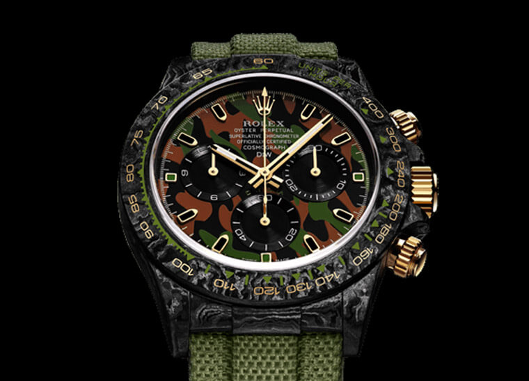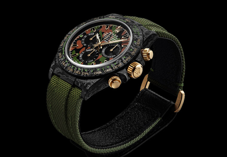 ▲表款以碳纤维材质制作表壳,同时面盘也换上了迷彩图案,搭配军绿色尼龙表带,摇身一变成军风Daytona。Source:designa-individual