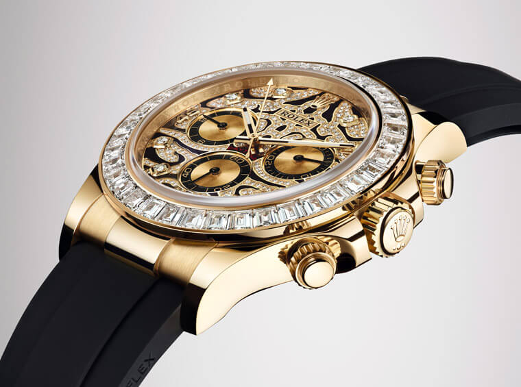 116588TBR乍看之下视觉魅力似乎不像更早之前推出的Daytona彩虹圈116595RBOW,但实际上116588TBR镶嵌的钻石数量更胜彩虹圈,总计它的表圈镶有36颗方钻、面盘上还有8颗钻石时标以及多达243颗的美钻,因此虎之心虽然搭配的是Oysterflex橡胶带,但是它的定价硬是比搭配玫瑰金链带的116595RBOW要高出一点,目前市场价格更是飆到14万美金之多、等于超过台币400万!
