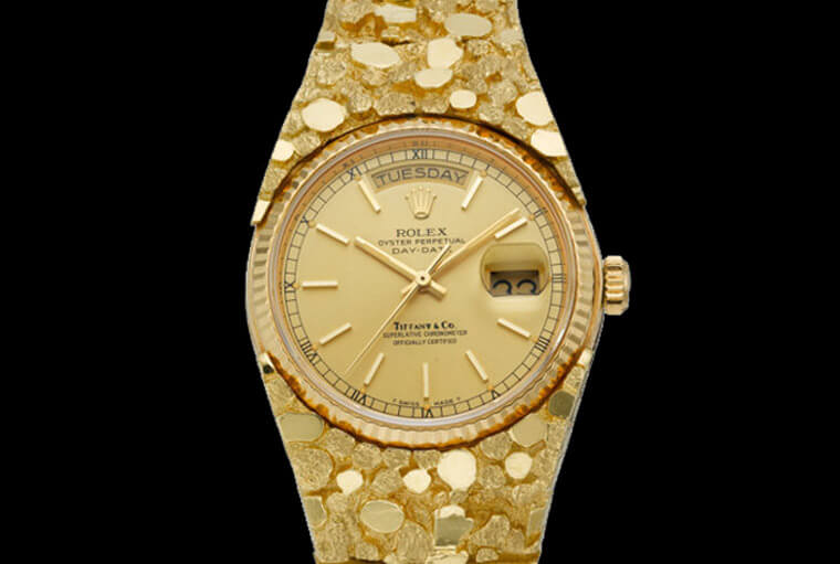 阿姆当天表演时看似穿着简单朴素,一身的黑帽、黑衣、黑裤,仅搭配金项链和一只金表点缀,不过如果再仔细看一下阿姆戴的那款表,哎呦厉害喔,那是一款K金的古董Day-Date,从面盘的样子看起来手表已经有一定的历史,不过注意到面盘六点方向还另外印上”TIFFANY & Co.”的字样,这点让手表的收藏价值变得更高一些。