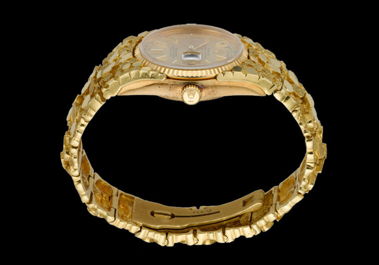 不过阿姆戴的这款劳力士Day-Date除了是TIFFANY联名款之外,它外观上最吸引人的地方莫过于K金链带,有别于金属链带常见的整齐打磨链节,这款表的K金链带反而式呈现不规则的「金属块状」,犹如在原本整块的金属上进行粗略的切削和敲击;不过如果是表面上看起来的把整块金属拿来敲打成型,那手表链带岂不就变成类似手鐲的型态?那样一来可能佩戴舒适度会打上折扣,但其实劳力士只是把链带表面做得像整块金属而已,其实链带内侧都还保有链节的活动装置(底下也还是连着表扣那些),因此就佩戴的舒适度和尺寸大小等方面都没有太大问题。