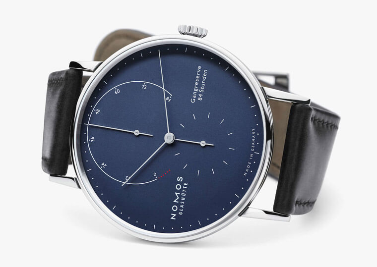 ▲Lambda Deep Blue是NOMOS少数表径超过40mm的款式,其搭载手上链机芯,手表面盘上超大的动力储存显示相当醒目。