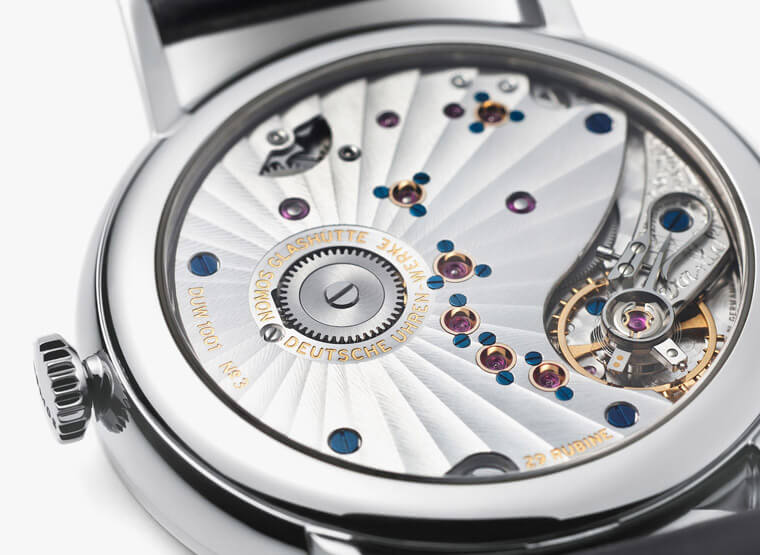 ▲Lambda Deep Blue搭载的是品牌自制的DUW 1001机芯,包括格拉苏蒂饰纹、摆轮夹板雕花等都很有德式手表风格。