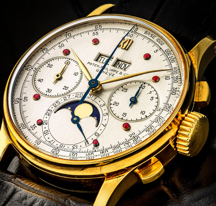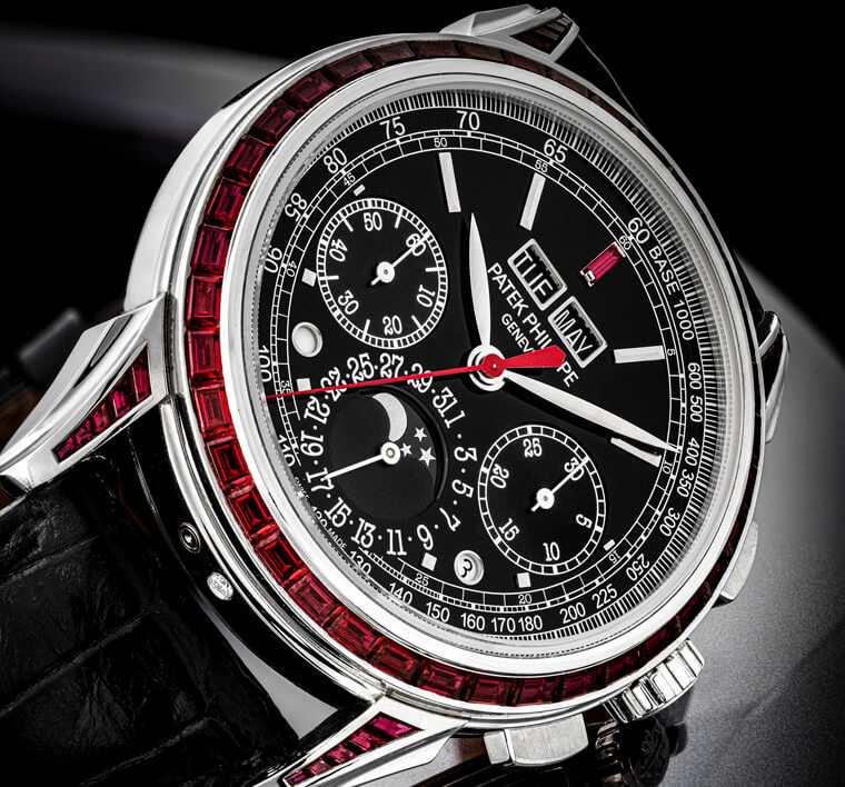 本场拍卖中最新的款式为百达翡丽于2015年制作的一款5271万年历计时码表,它以铂金材质制作表壳,同时包括表圈、表耳以及面盘12点方向都镶有红宝石,估价相对亲切(230,000~350,000美金),但这是因为跟同场拍卖其他珍品相比而言,光手表本身的拍价其实还是非常可观。
