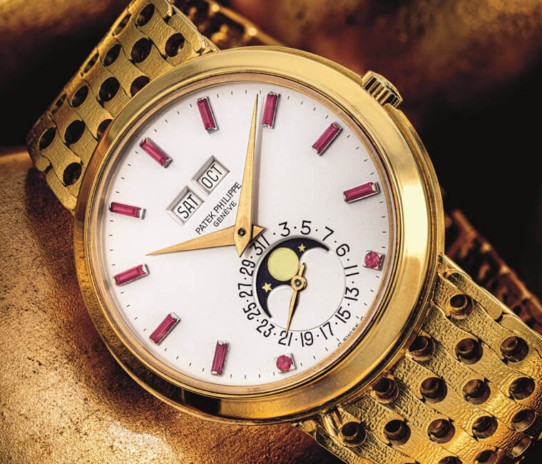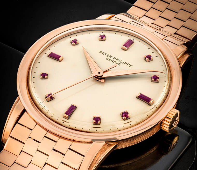 百达翡丽于1968年打造出首款自动上链万年历手表,其中3448/8面盘镶有矩形红宝石时标,据称也可能是同型号中唯一採用这种设计的特例,使得这款表预估价冲到500,000~1,000,000美金的高度。