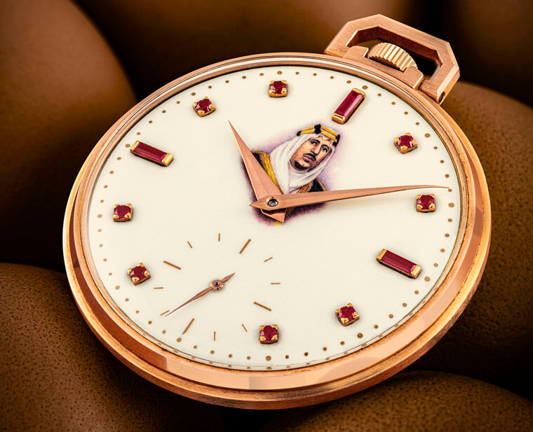 同样为了沙乌地阿拉伯国王而生的时计作品尚有一款1956年制的600/1怀表,其以白色珐琅制作面盘,上头镶有红宝石时标,同时面盘12点方向则可见到沙乌地阿拉伯国王的肖像,预估价为25,000~50,000美金。