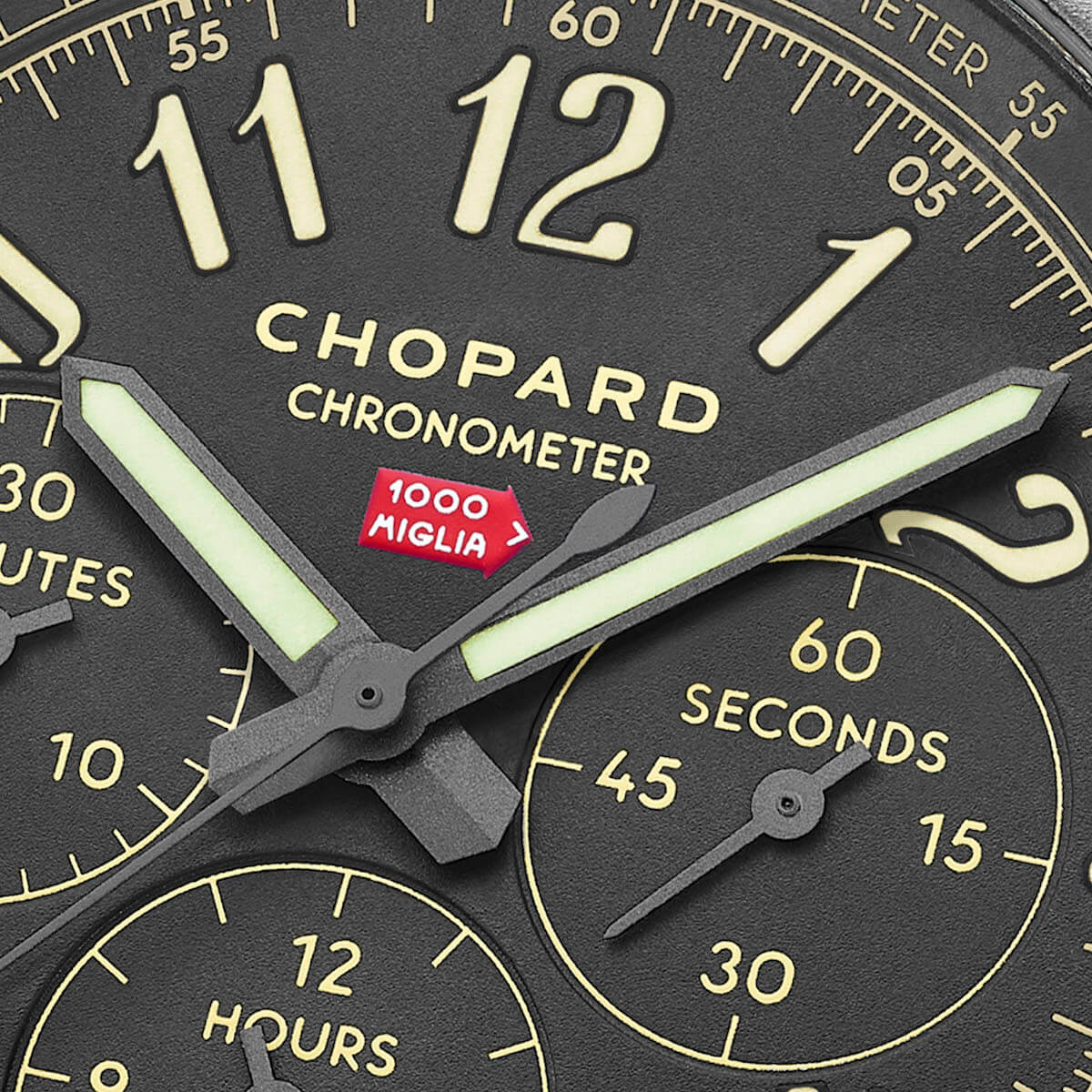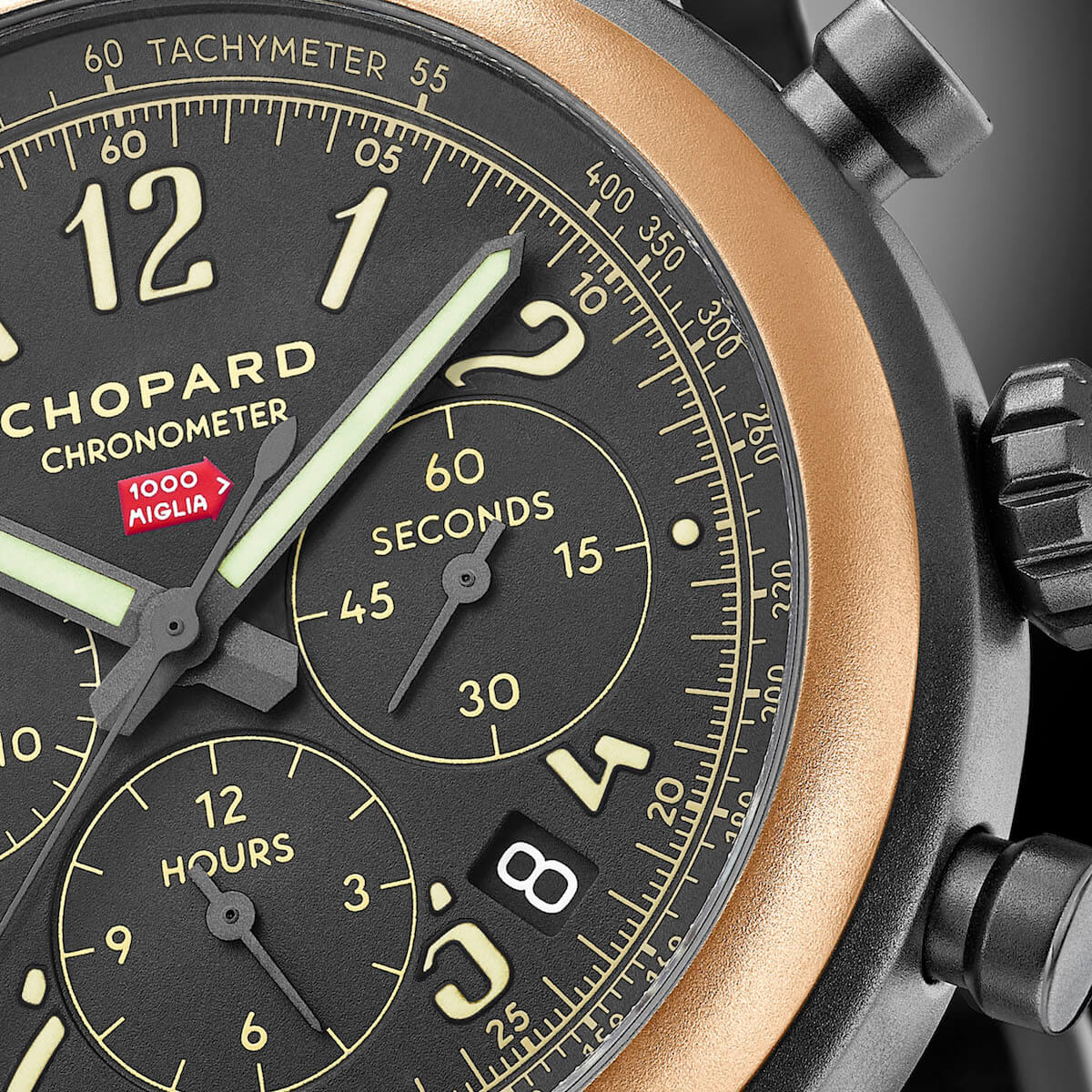 阿拉伯数字时标採用复古黄色除了新鲜感,涂上Super-LumiNova®超级夜光让人赏玩时增添不少情趣,即使在光线不足的环境中也能轻松读时,三个计时副表盘上清晰地标示着60秒、30分钟和12小时显示刻度。引人注目的日历显示窗位于4时30分位置,加上秒针末端的一抹红色,巧妙地呼应1000 Miglia千里赛着名的红色方向箭头,也是这款计时码表在向恩佐‧法拉利Enzo Ferrari称赞的「世界上最美丽的赛事」致敬。