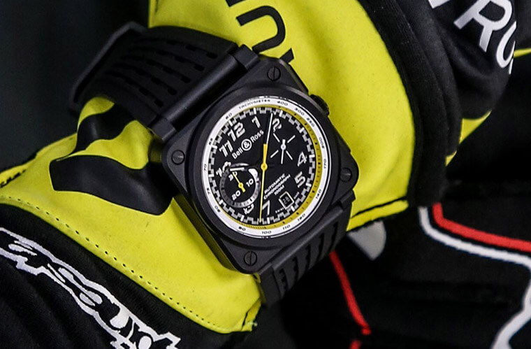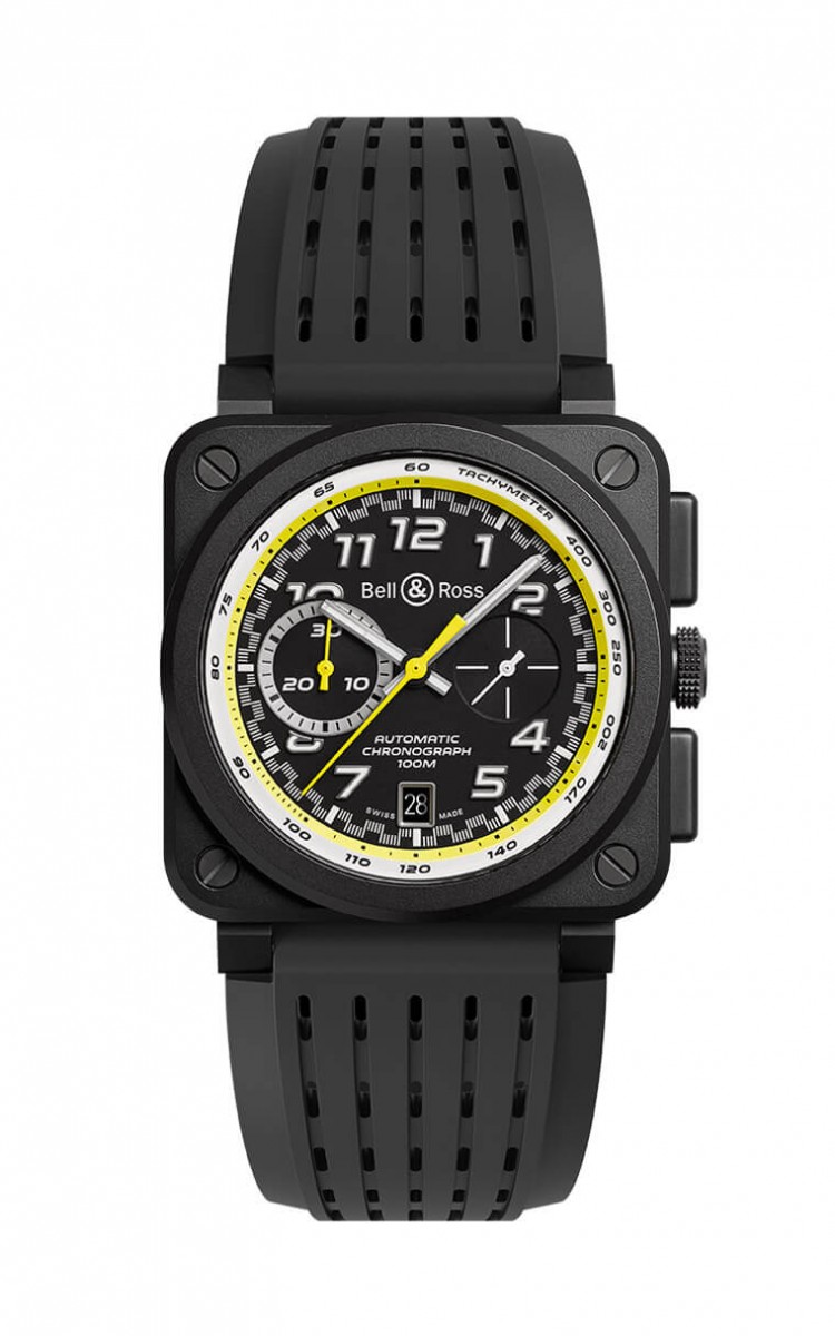▲BR 03-94 R.S.20纯粹以以黄、黑、白三色打造更为俐落的面盘风格,柏莱士甚至利用分钟刻度的虚线造型交织出方格旗印象。