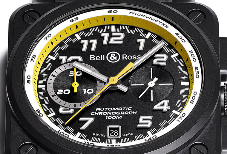 ▲柏莱士计时码表一般会将日期显示设在4~5点方向,但是BR 03-94 R.S.20则是将日期窗改成矩形并移到6点方向,面盘因此看起来更对称。