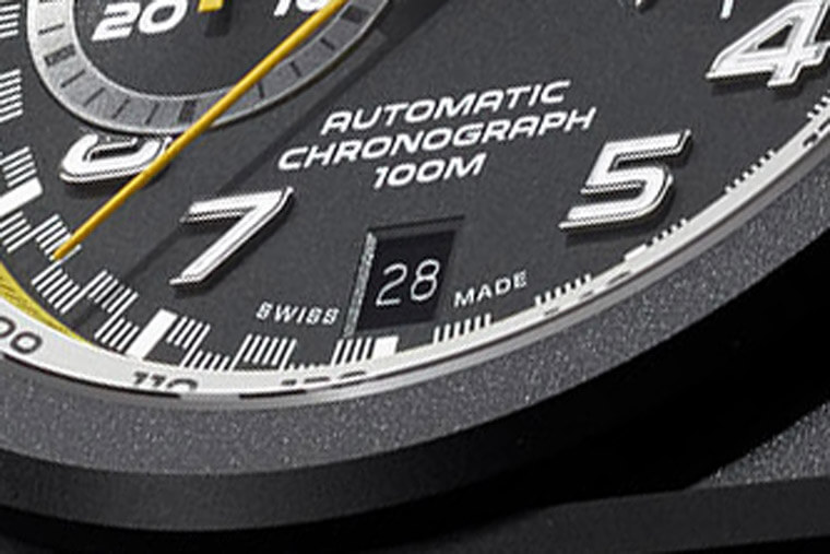BR 03-94 R.S.20的面盘依旧是以黑色系为主,面盘外缘设置採用白底黑字的测速计刻度,同时在测速计内侧还结合了黄色刻度环;而再往裡面看,柏莱士于分钟刻度上採用上下交错的白线与黑色空格,远看会觉得有点眼熟,这边有点结合赛车场上方格旗的造型。除此之外的面盘造型大致和R.S.19相去不远,包括3点方向的小秒盘和9点方向的计分盘,R.S.20这次针对两枚小表盘进行了修改,包括把表盘都改回圆形、小秒盘只简单设置四方位刻度、计分盘多加了一个外框,此外BR 03-94 R.S.20的指针和刻度也仅採用白色或黄色,看起来更明快俐落。