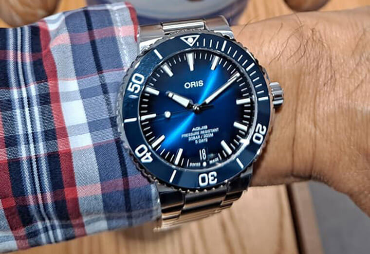 ▲手表外观跟一般的Aquis潜水表大同小异,但是在面盘6点方向多了一行”5 DAYAS”字样,突显手表的超长动能。