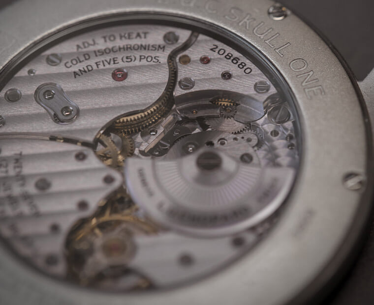 ▲表款的镀金指针、时标皆经过细致的拋磨修饰,与面盘上的Calavera骷髏图案搭配展现职人制作的专业风采。