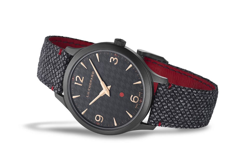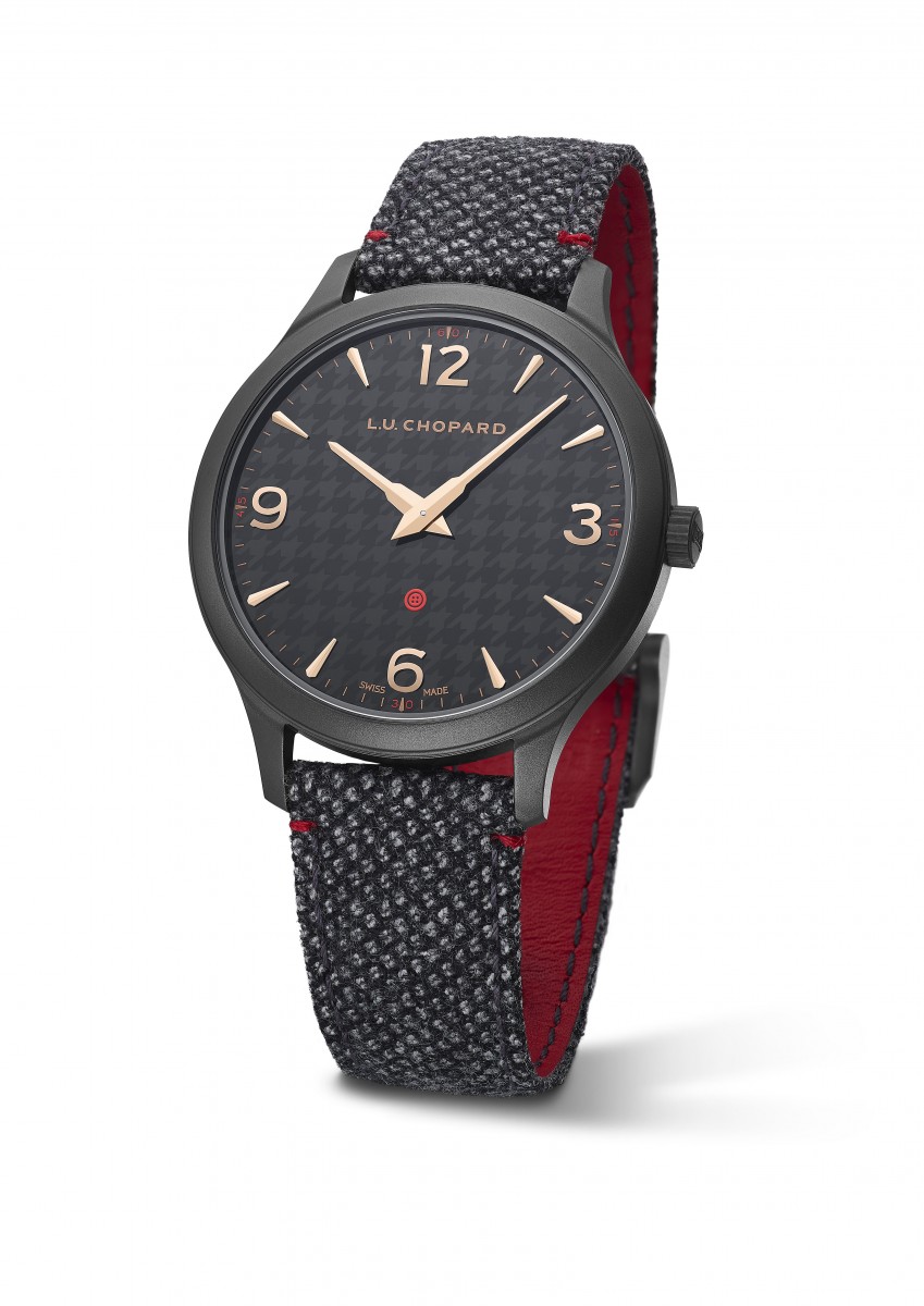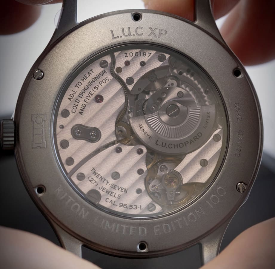 表款搭载的96.53-L机芯仰赖钨金微型自动盘塑造超薄外观并透过Twin技术双发条盒输出58小时动能,特别的是,萧邦还选用深黑色蓝宝石水晶制作底盖,使得表背露出的机芯结构散发出与腕表正面相同的黑色调,突显表款的联名限量作品身份。而这款表的表带採用未经化学处理的蒙古羊绒、羊毛、法兰绒和少量氨纶的柔软混纺布料手工缝制,搭配红色鱷鱼皮衬裡表现奢华主张,于此再度展现出KITON「西装之王」的工艺精华。