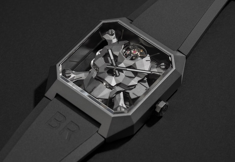 BR 01 Cyber Skull的的表壳尺寸达到45x46.5mm,它的表耳与表壳一体成型,搭配黑色橡胶表带,有别于系列之前作品常搭配皮表带的惯例,造型令人耳目一新,同时强势标志着品牌设计风格迈入新里程。