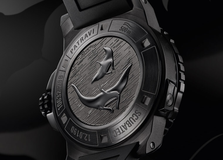 ▲虽然面盘换成鱼鳞造型纹路,但从底盖上鐫刻的魔鬼鱼图案,还是能够发现手表特别的创作渊源。