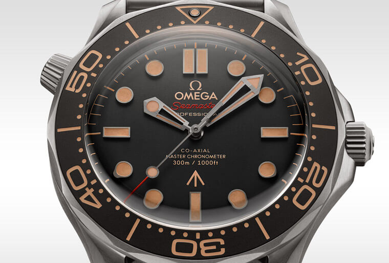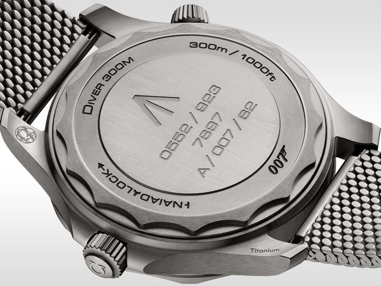 据说丹尼尔‧克雷格也有参与手表的设计过程,尤其是复古风格这块,所以欧米茄採用米黄色Super-LumiNova夜光涂料涂在刻度、时标与指针等部位,打造出Tropical风格。另外包括表圈部分,现在的海马潜水300米几乎都是使用陶瓷表圈了,唯独这款007限定款反而是回到比较旧式的铝圈,用意想来也是为了配合复古主题,但要注意的是它的耐刮、抗磨损效果就不如陶瓷圈出色了。此外这款007限定款还有个不一样的地方在于它捨弃透背改用实底盖,底盖上刻了一些奇妙的数字,一一解读的话分别是:”0552”是海军人员的独特代号、”923 7697”是潜水表的代号。字母”A”是手表採用旋入式表冠的代号,而007当然就是庞德经典的探员编号,数字”62”代表第一部庞德电影上映的年份。