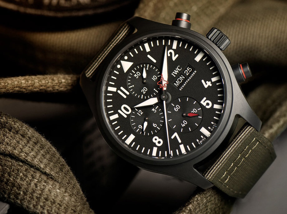 IWC是以制作飞行表见长的品牌,因此目前世上还是有不同国家或部队和IWC合作,偶尔IWC会替与其友好的军事单位制作非市售的特别版手表,用途包括庆祝单位或部队周年、祝贺军事学校毕业生毕业、致赠有功人员等等,因此”SFTI”特别版其实也就是由这类的渊源中延伸出来。事实上”SFTI”是一个缩写名称,它的全名是”Strike Fighter Tactics Instructor”,这个名称的灵感来自IWC 2018年帮美国加州勒穆尔海军航空基地所制作非市售的特别版手表,当年该基地的教官和品牌合作打造手表以送给美国海军战斗机武器学校毕业的学生,因此2020年IWC以特别版的名义推出了市售的”SFTI”计时码表,手表的整体造型和2018年的作品风格类似,包括黑色表壳、面盘搭配军绿色的织物表带,比较明显的差别就是2020年的市售版不再把海军战斗机武器学校的徽章放在面盘上。而且市售版将计时大秒针末端平衡器改为红色的镂空飞机造型也建立起专属自己的特色,这点也是Top Gun系列其他作品所没有的亮点。
