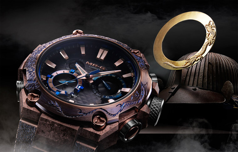 至于近期MR-G系列在表迷间备受瞩目的作品非MRG-B2000SH-5A「冲击丸」莫属,这个霸气的名称来自传统的日本武士头盔,当初G-SHOCK为了打造这款独特的MR-G腕表而特别订制了这麼一款头盔,腕表表圈上的图案源自于头盔前立部份,品牌邀请到负责制作头盔前立巨龙浮雕的金雕大师小林正雄操刀打造表圈,另外腕表表壳、链带的不规则纹路则是受到冲击丸头盔「鉄錆地」工艺的启发,以砂模加上手绘的形式创作,后续又採深层硬化处理、离子电镀等技术塑造出MRG-B2000SH-5A外观独树一帜的风霜铁锈感。除了以创意与精湛工艺淬炼成的迷人外观,MRG-B2000SH-5A蕴含了蓝牙连结与世界六局电波接收系统等G-SHOCK最尖端的科技,其他品牌腕表常见的功能性也一应俱全,而它仅限量发行400只、定价23万台币更是远高于一般石英表的境界,这样的作品无疑是卡西欧制表工艺最极致的表现。