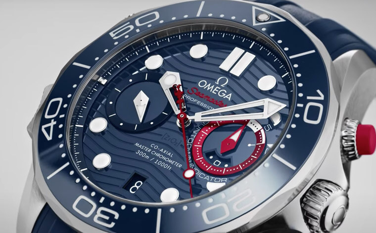 ▲欧米茄採用蓝色和红色柔软橡胶材质打造计时按把,用意在于提升水中操作时的触感。