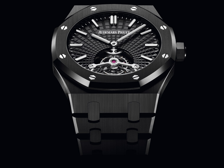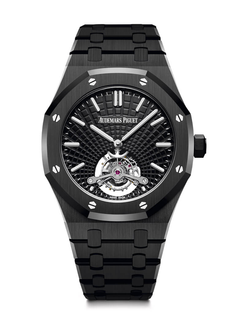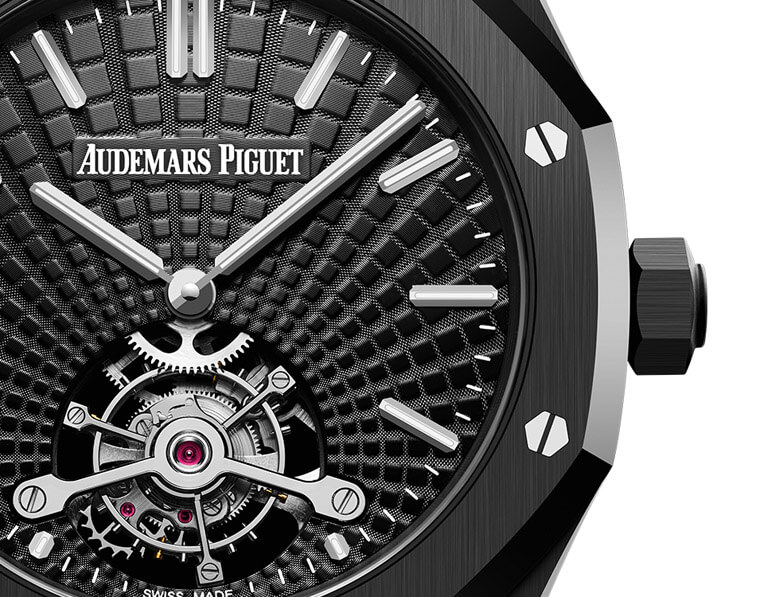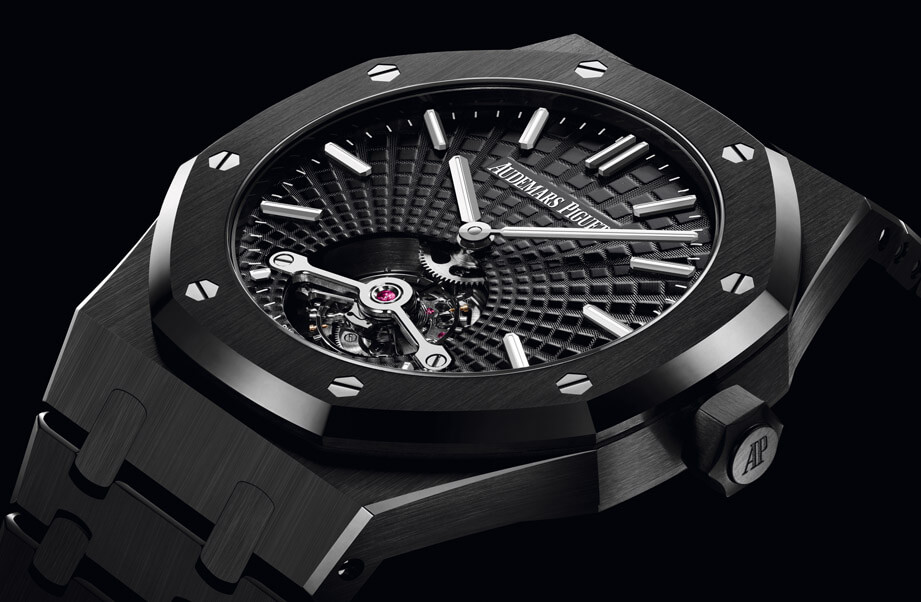 ▲过往皇家橡树41mm超薄陀飞轮皆採用金属表壳,爱彼首度为其换上黑色陶瓷表壳,包括链带也改为陶瓷材质,耐磨抗刮的保护性更佳。