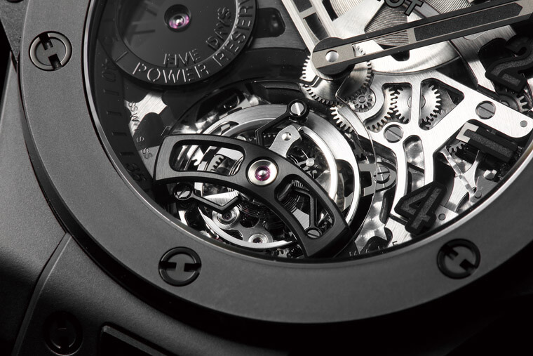 表款一如外观所示为黑色陶瓷材质,表圈则以6颗H型黒色PVD钛金属螺丝锁入表体,呈现出表款浓厚的阳刚属性,HUBLOT招牌的复杂机械结构机芯,在面盘上也可以一览无遗,表款也同时继承Tourbillon Power Reserve 5 Days系列的面盘布局,如九点钟位置的动力储存拥有黑与红的顏色配置,六点钟位置则以陀飞轮装置为主,拥有横跨式黑色桥板的陀飞轮结构,与HUBLOT一气呵成的高科技工业风格完全贴合,表款搭载了品牌陀飞轮手表主力的HUB6016手上链机芯,指针则以半镂空的设计,避免遮挡到面盘机芯结构的美丽。