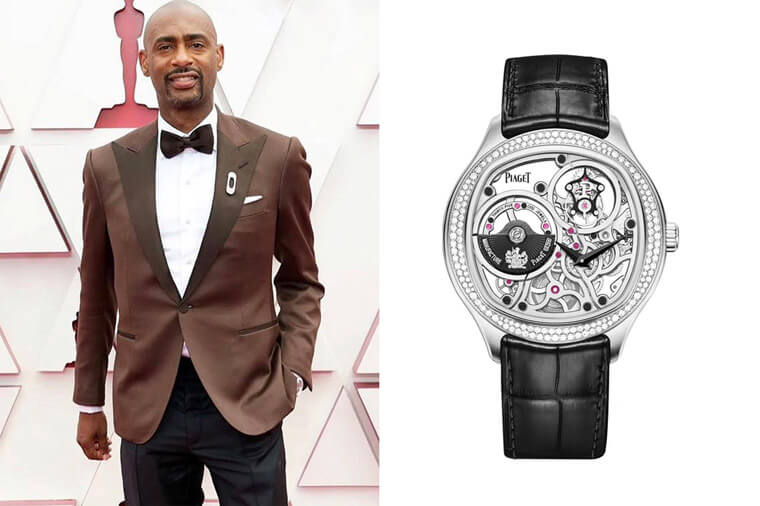 斩获最佳原创歌曲和最佳男配角等奖项的《犹大与黑弥赛亚》(Judas and the Black Messiah)制片人Charles D. King在他棕色西装外套搭配深色西装裤的装扮下,手上佩戴了一款伯爵的高端手表Polo Emperador Skeleton Tourbillon,这款表具有陀飞轮等级的复杂功能,面盘上也可见微型自动盘装置,镂空设计强化了手表的立体感,另外它的表圈更是镶上了数以百计的美钻。Polo Emperador Skeleton Tourbillon的尺寸有49mm那麼大,因此可见Charles D. King戴在手上时的存在感也非常强烈。