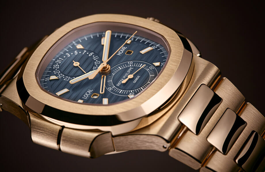 PATEK PHILIPPE百达翡丽旗下Nautilus系列的5990/1两地时间计时码表最初在2014年登场,那时PP採用不锈钢材质表壳搭配黑色渐变面盘,在此系列的万年历款式5740/1G还没问世前,5990/1以兼具计时码表、两地时间日夜显示与指针式日期等多种复杂功能位列金鹰系列最复杂手表之位,后来虽然有5740/1G加入系列阵中,但是5990/1的复杂度和实用性依旧没话说,这也促使品牌在2021年加码增添了玫瑰金版本的5990/1R。