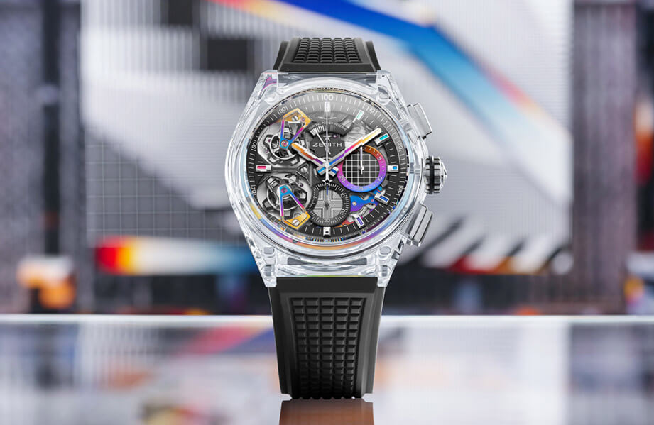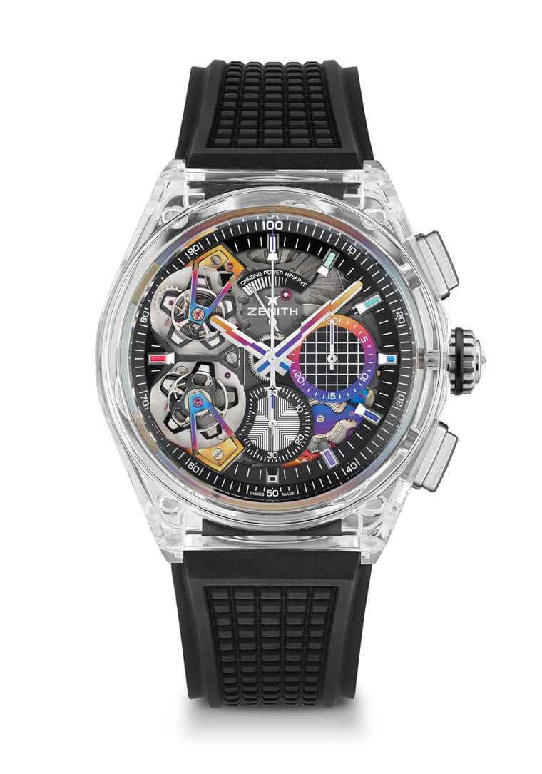 蓝宝石水晶材质/El Primero 9020自动上链机芯/时、分、小秒显示/双陀飞轮装置/计时码表功能/蓝宝石水晶镜面、透明底盖/防水30米/表径46mm/限量1只/预估价:CHF 180,000~220,000
