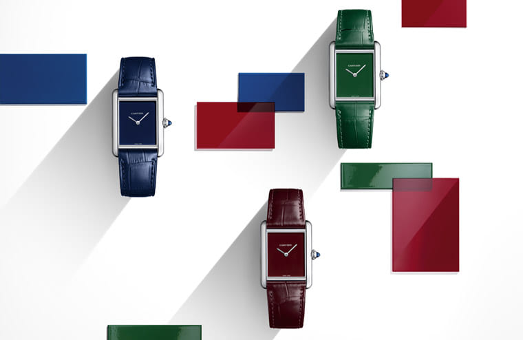 卡地亚2021年替Tank Must开发出彩色面盘款式,共有红色、蓝色与绿色等三种顏色,搭配与面盘顏色一致的鱷鱼皮表带,最特别的是手表面盘完全去除时标与刻度等顏色,以纯粹的色彩展现时尚设计风格,戴在手上会成为佩戴者身上最抢眼的配件之一。