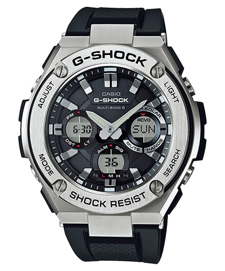 属于G-STEEL系列中比较时尚设计的款式,除了指针和数位双显之外,它的表壳也採用树脂和金属材料的组合。手表的表圈由不锈钢制成,但底盖结合了作为缓冲的树脂材质来保持抗冲击性。在设计方面,金属的质感有一定的吸引力,至于世界六局电波和可以自己补充电力的太阳能等功能也很方便好用。(GST-S310-1A无电波和太阳能)
