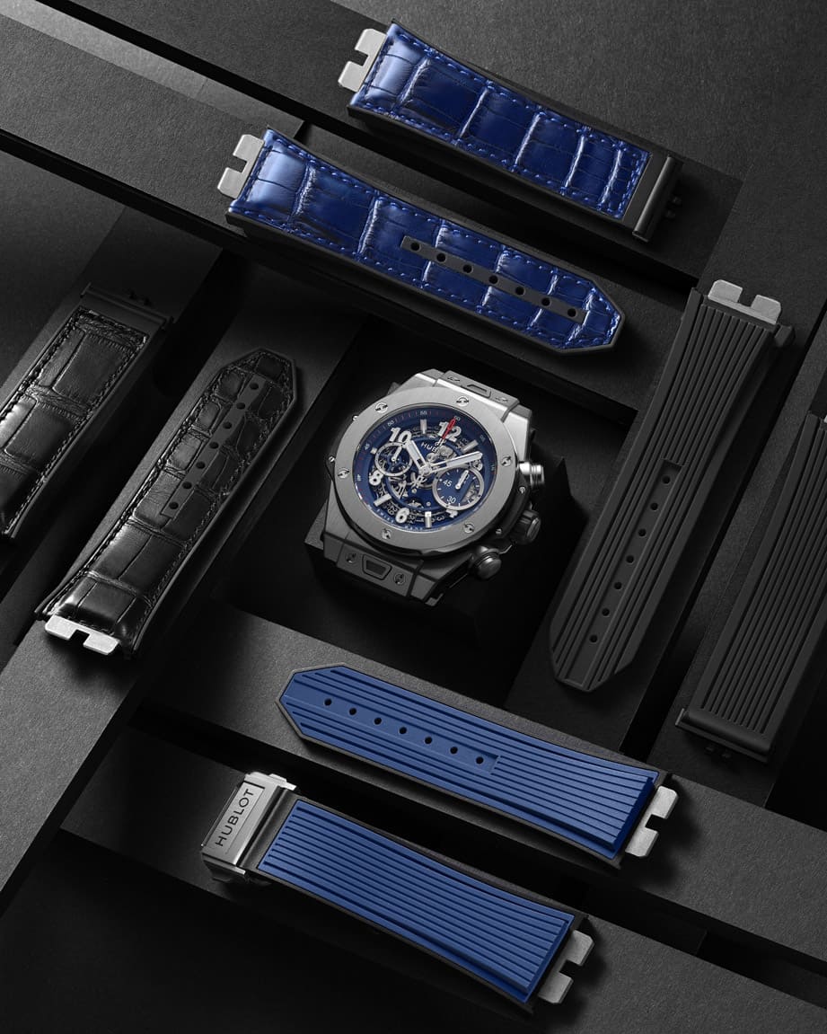 现在有愈来愈多品牌和手表纷纷标榜具有便利好用的表带快拆设计,但是宇舶Big Bang Unico少说在2013年就已经出现品牌着名的"One Click”单键替换表带快拆装置。一般Big Bang Unico蓝面计时码表(包括钛金属或皇金)配置的是蓝色橡胶表带来呼应面盘主题顏色并强化手表的运动风格,但若表主戴表戴了一阵子想要换换造型,这时不需要再另外入手另一款表,只要花相对亲切的代价入手宇舶提供选配的表带零件,那麼就可以直接更换不同顏色的橡胶表带,或是皮革表带都没问题,一表在手就能变化出多样个性,这点也很合当前市场注重搭配性的需求。