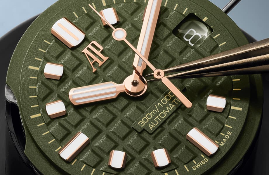 必知亮点:新款ROO潜水表的机芯从原本的3120机芯换成品牌新一代的4308自动机芯,这枚机芯的自动盘虽然也是22K金材质,不过品牌替其镀上黑色并加以镂空,盘面上也只保留AP Logo,道出机芯的家族血统。4308机芯的规格和3120机芯没有明显的变化,不过它的震频提升到4Hz、零件数减少至234枚,机芯直径也扩增至32mm,这些都是比起3120机芯更为深入的进化细节。新款皇家橡树离岸型潜水表有蓝色、灰色和绿色面盘,其中绿色不仅是品牌继前几年后再度重现的配色,也是现在市场深受玩家欢迎的热门色,至于这款新生代ROO潜水表与旧款相比不只是面盘顏色更换,面盘细节如时标变得更粗、12点方向本来的AUDEMARS PIGUET字样如今已简化为体AP Logo,使手表看起来又更简洁一些。