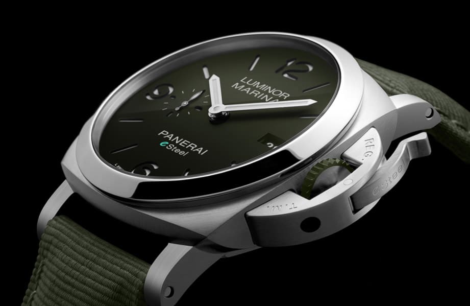 必知亮点:沛纳海近年持续在材质研发领域施力,继EcoTitanium™环保钛金属材质后,这款PAM01356则是启用同样具有环保概念的eSteel™材质,简单来说这是一种再造钢合金,手表的表壳与面盘都是以这种新颖的环保材质打造,它的制作过程可以降低对原料开採所耗费的能源与资源。PAM01356整只表共重152.4克,其中沛纳海光以环保再生物料制作的部分就有89克,比例高达6成左右。而为了让再生的钢合金表现出和一般不锈钢表壳接近的特性,沛纳海前后和许多领域的品牌和厂商合作,最终调配出让手表的化学特性、物理结构和耐腐蚀性等层面都能和传统不锈钢相提并论的成份。此外不止表壳,手表搭配的织物表带也是以再造PET树脂材质为基础,连同梯形表扣都还是用eSteel™材质制成,高比例的环保物料突显手表核心主题。