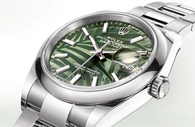 必知亮点:继先前Oyster Perpetual的彩色漆面后,2021年劳力士推出的Datejust 36则是琢磨在以超短脉冲(Ultrashort Pulses)雷射制成的棕櫚叶或坑纹图案,其中棕櫚叶图案灵感来自生机盎然的热带雨林,面盘上有些棕櫚叶片还会呈现重叠的传神效果,细腻加工制成的图案搭配品牌首波採用的绿色调,使得面盘看起来真的有一种置身在大自然中的生命力。换上新面盘效果的Datejust 36与系列其他主要使用太阳放射纹的作品明显产生一些微妙的差异,就像2020年换上糖果漆面的Oyster Perpetual,原本中规中矩的入门款一下变得很有话题性和魅力,而Datejust 126200在2021年4月刚问世不久,身价也一度冲高到14,800欧元的高峰,可见新面盘的确有助于拉抬手表的声势