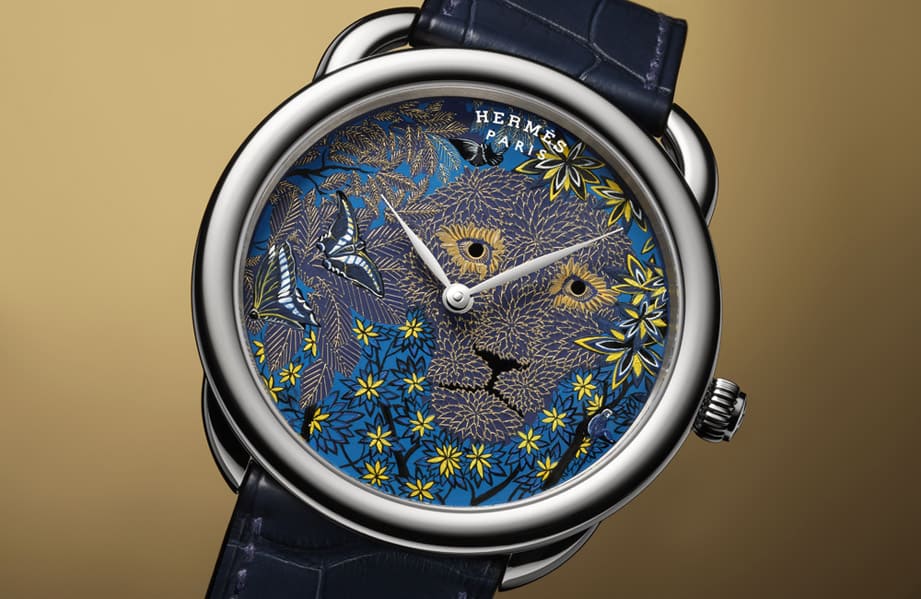 HERMÈS爱马仕新作Arceau Wild Singapore手表再度展现品牌独特美学素养以及擅长融入少见装饰工艺于手表作品中的巧思,表款採用白金材质打造Arceau富有辨识度的不对称特色表耳表壳,至于面盘图案则是从Alice Shirley为爱马仕设计的2021年春夏系列同名丝巾获得灵感。