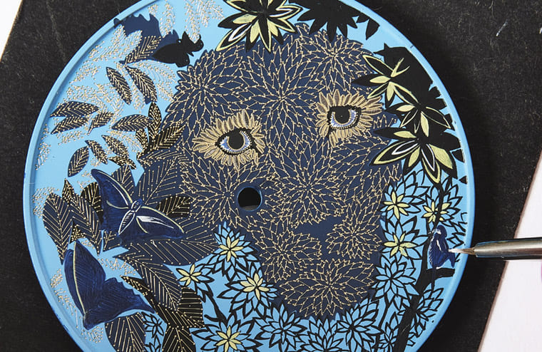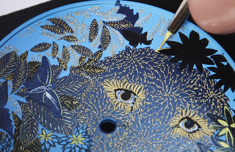 待替面盘图案勾勒出轮廓并添上富有生命力的顏色后,后续品牌工艺师还会在面盘接合许多条金线,这些线的直径只有人类头髮的1/3而已,制作过程中工艺师要先确认好每条金线的起讫点,接着在图案表面上凿洞做记号,最后先将纯金注入这些附着点,然后与金线的两端融合。每条金线都有既定的顺序和位置,目的是营造出图案视觉的穿透度和光影变化,大体而言,每枚Arceau Wild Singapore手表的面盘都需要经过一周的工时才能完工,说的明确一点,单就微绘部分的工时约需20小时,打线接合则要花费三天以上的时间,制作难度可见一斑。